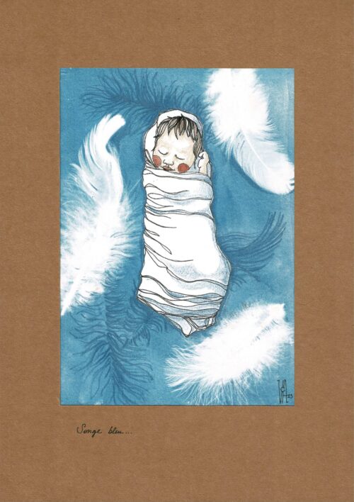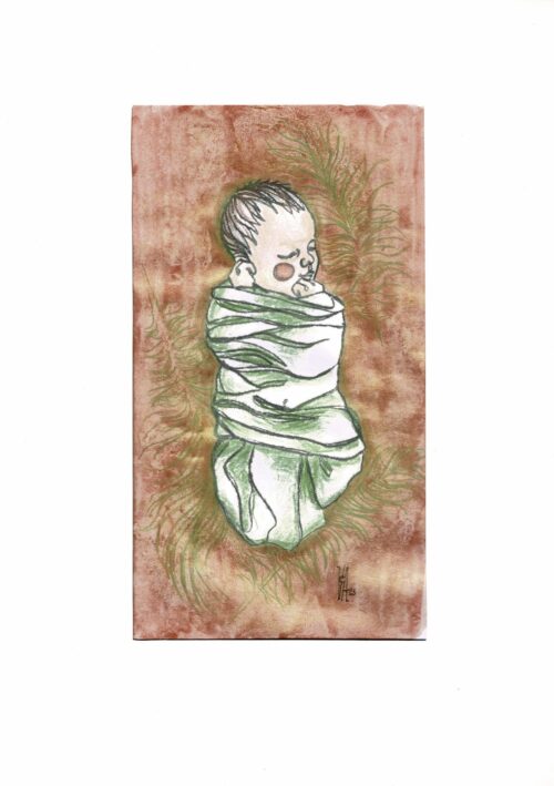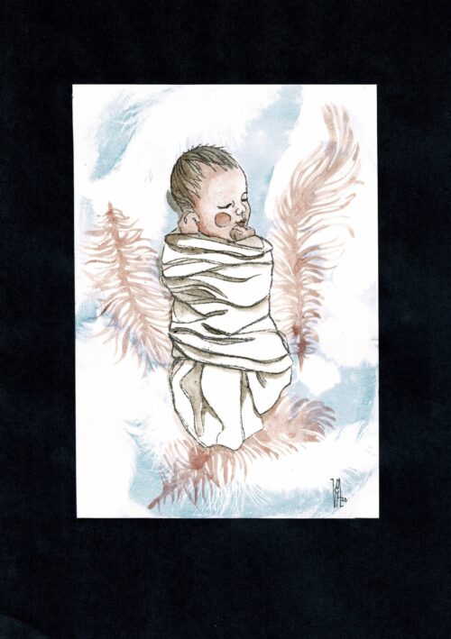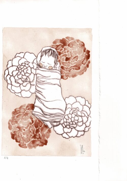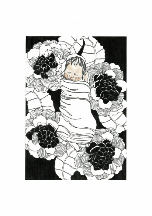 Bébé fleuri vert – dessin au feutre fin et encre végétale